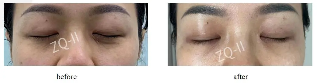 Behandling: drivs ZQ-II PLLA-näringsämnen fyller 3 gånger inom 6 månader Efter: fina linjer och mörka cirklar runt ögonen bleknar synligt