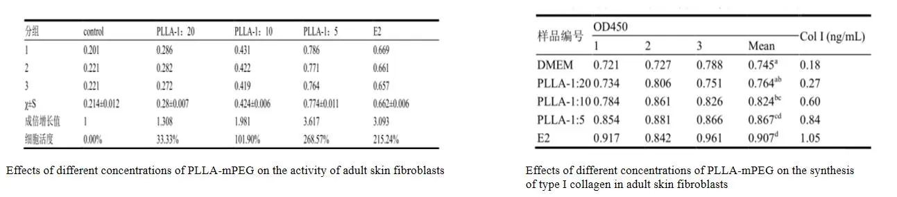För att observera effekten av ZQ-II PLLA-näringsämnen fyller ikollagenförnyelse, olika koncentrationer av PLLA-MPEG på aktiviteten avVuxen hudfibroblaster och syntesen av typ I -kollagendetekterades av MTT och ELISA. Efter att ha behandlats med PLLA-MPEG ökar antalet celler avsevärt och ökar med ökningen av PLLA-MPEG inom ett visst intervall, vilket indikerar att PLLA-MPEG signifikant kan främja vuxen hudfibrogenescellproliferation kan främja utsöndring av typ I kollagen i vuxna hudfibroblaster.